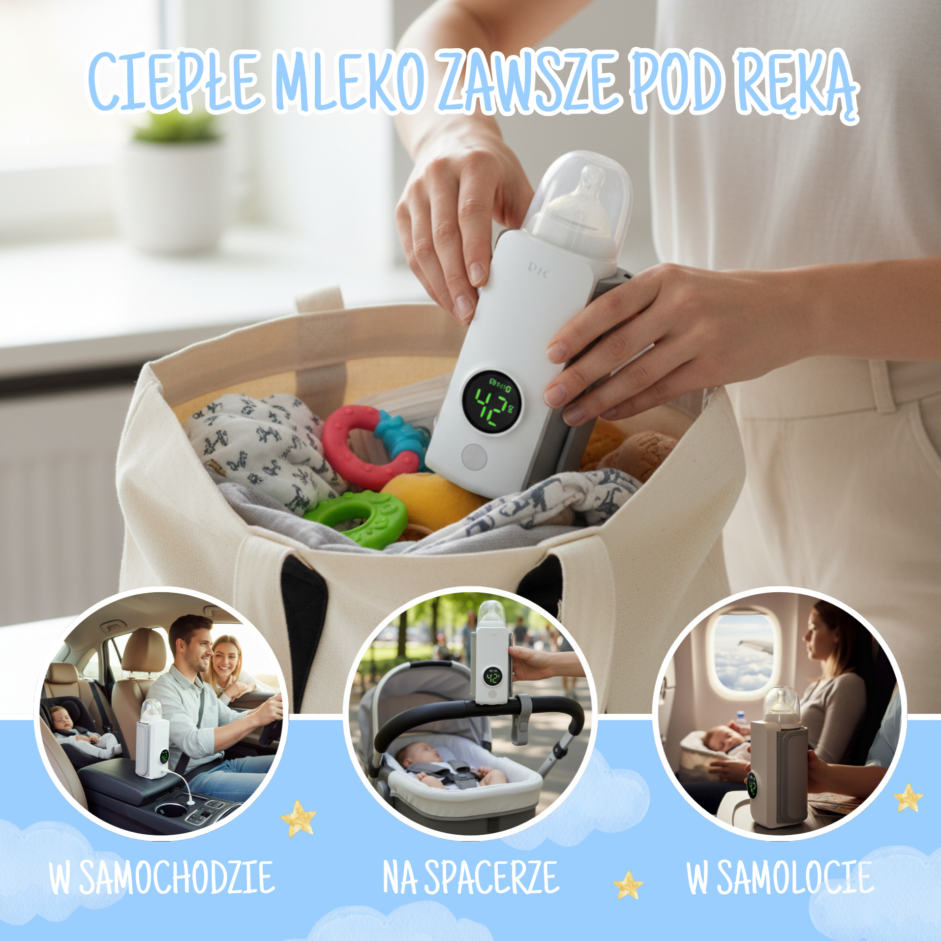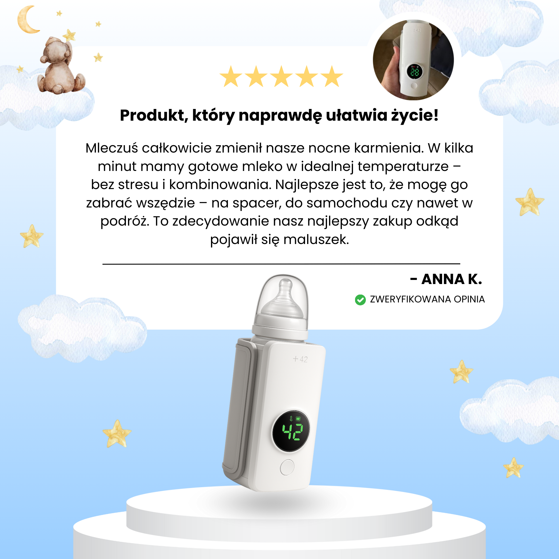 Mit Mleczuś ist Füttern einfach und bequem – egal wo und in welcher Situation. Im Auto, beim Spaziergang oder im Flugzeug – Sie haben immer perfekt erwärmte Milch für Ihr Baby dabei.