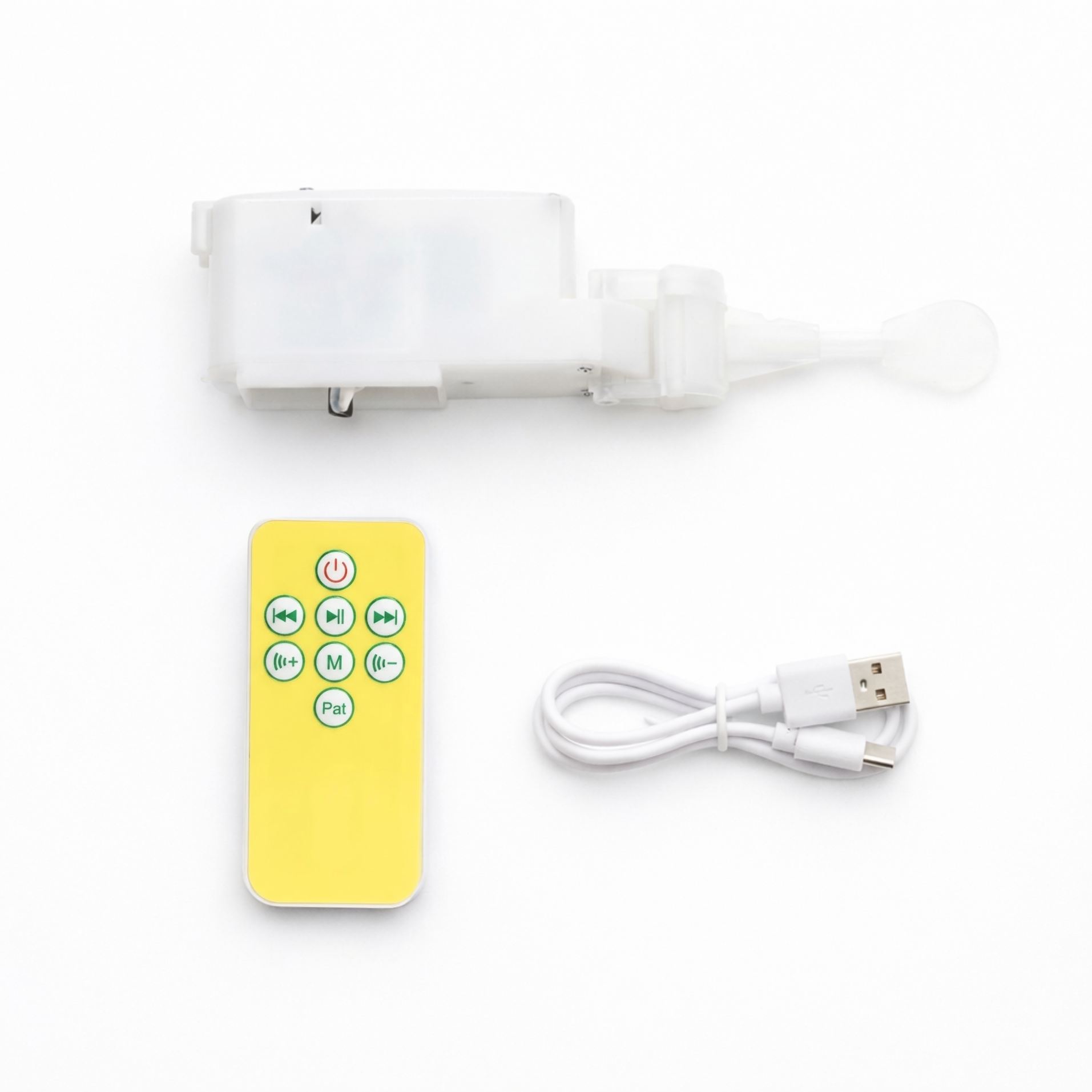 Klepiś jest w pełni sterowany pilotem – wystarczy jedno kliknięcie, by włączyć, wyłączyć lub zmienić tryb klepania, bez podchodzenia do łóżeczka i bez ryzyka wybudzenia dziecka.
