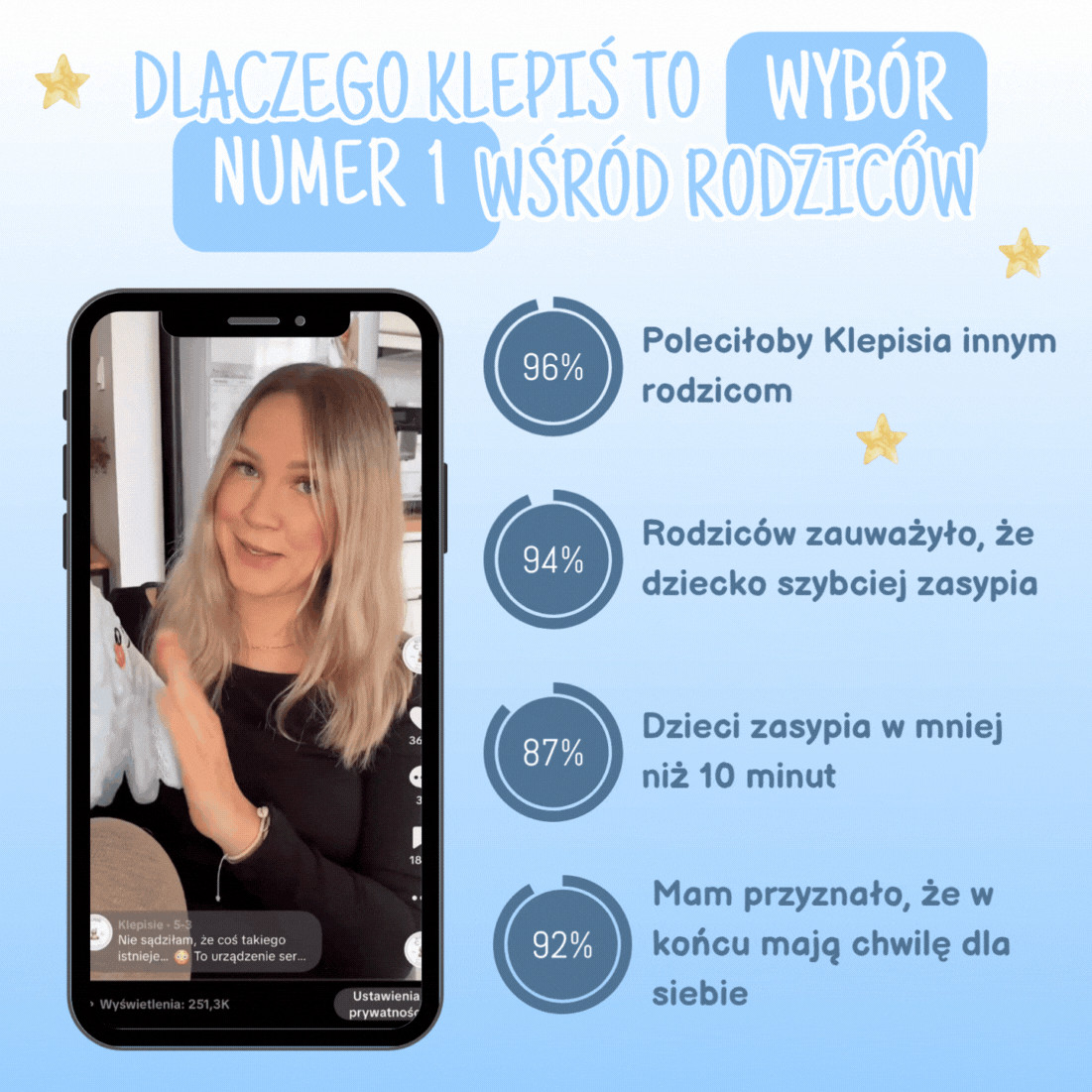 - Potwierdzają to rodzice – Klepiś został przetestowany przez setki mam i tatów, którzy podkreślają, że daje im chwilę wytchnienia i realnie uspokaja dzieci.