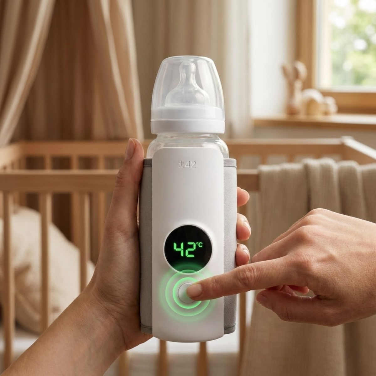 Mleczuś to rewolucja w karmieniu. Zapomnij o szukaniu kuchni w podróży, termosach z ciepłą wodą i nerwowym sprawdzaniu temperatury. Wystarczy założyć opaskę na butelkę, wybrać temperaturę i po kilku minutach mleko jest gotowe – idealnie ciepłe i bezpieczne.